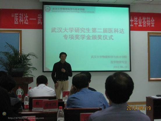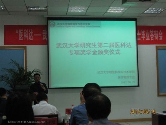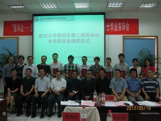 2012年5月19日,第二届医科达——武汉大学医学物理专业研究生专项奖学金颁奖在物理科学与技术学院三区南报告厅隆重举行。武汉大学物理科学与技术学院党委书记付兴荣、副院长谭志杰教授、医科达医疗器械(上海)公司副总裁彭涛先生、武汉大学中南医院院长周云峰教授、中国医学科学院肿瘤医院胡逸民教授等国内肿瘤放射治疗方面的专家、学院医学物理专业的全体师生参加了会议,本次颁奖仪式由物理科学与技术学院党委副书记周洪元主持。